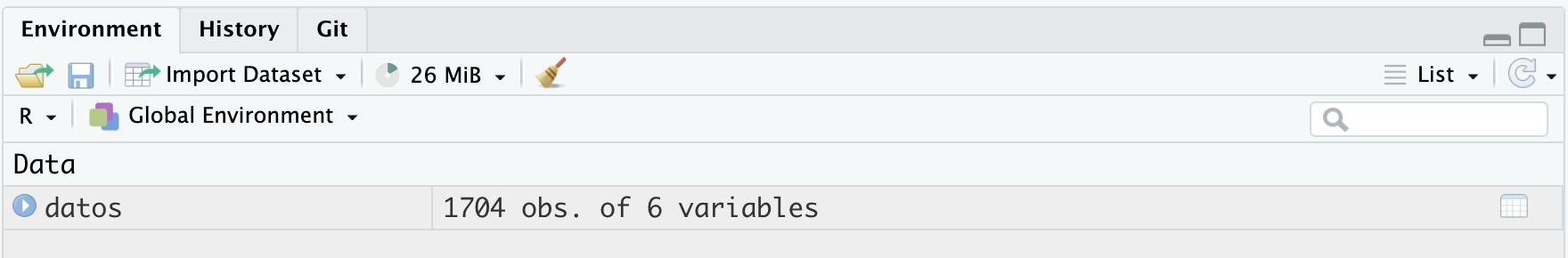 En esta segunda línea tenemos también el operador de asignación <- que lo que hace es asignar un nombre (la palabra que está a la izquierda) al elemento que está a la derecha. Entonces, esta línea podría traducirse de esta forma: “ponele el nombre datos al elemento gapminder que proviene del paquete gapminder”. Una vez que ejecutamos esta línea, si no hay ningún error, debería crearse en el panel “Environment” un elemento que se llame “datos” y que tenga 1704 observaciones y 6 variables: