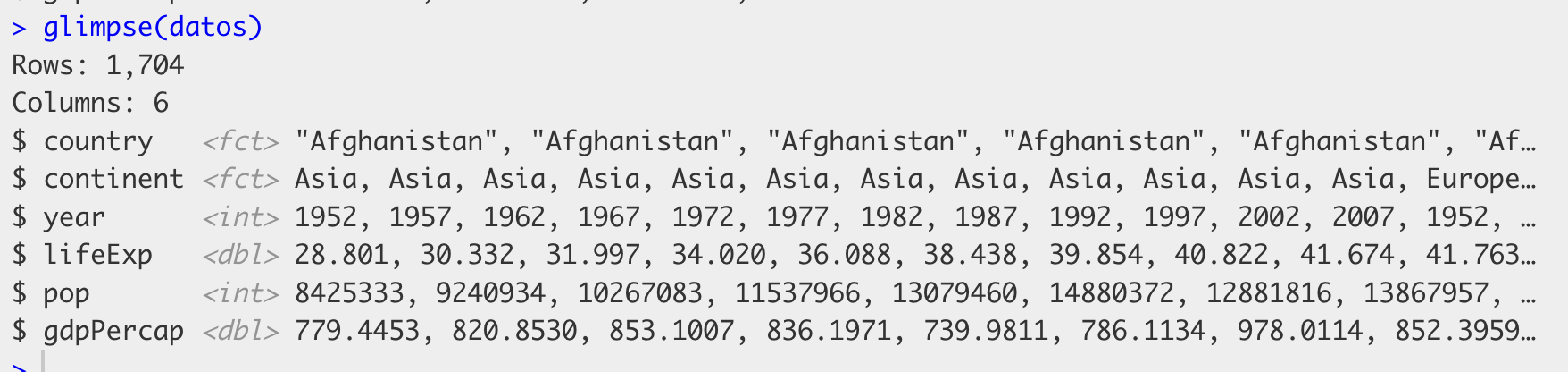 En cada fila de este resultado vemos primero el nombre de las columnas, es decir, de las variables (“country”, “continent”, “year”, etc), a continuación el tipo